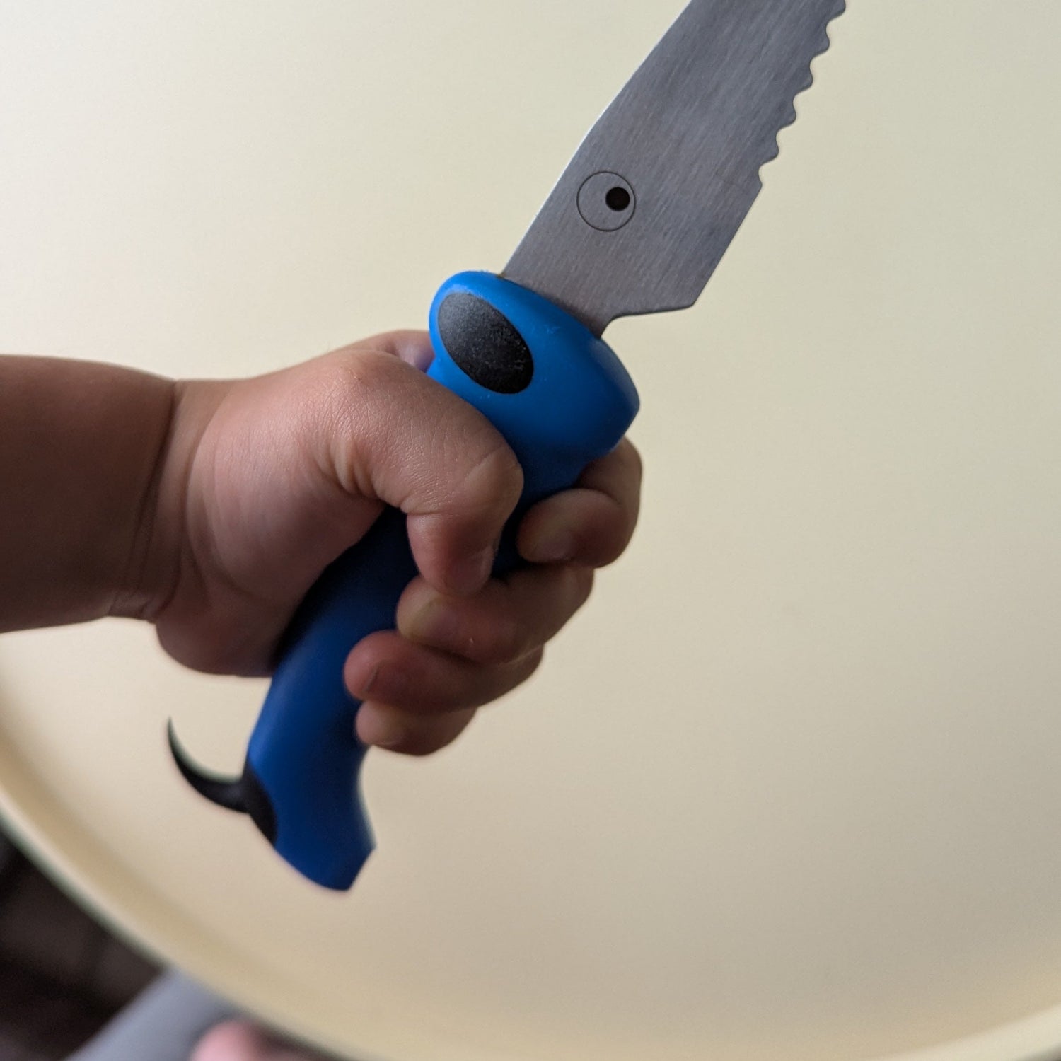 When I made the first knife for Eli, I wasn't sure if it was appropriate given he was only 24 months old. The edge was blunt but it was pointy....